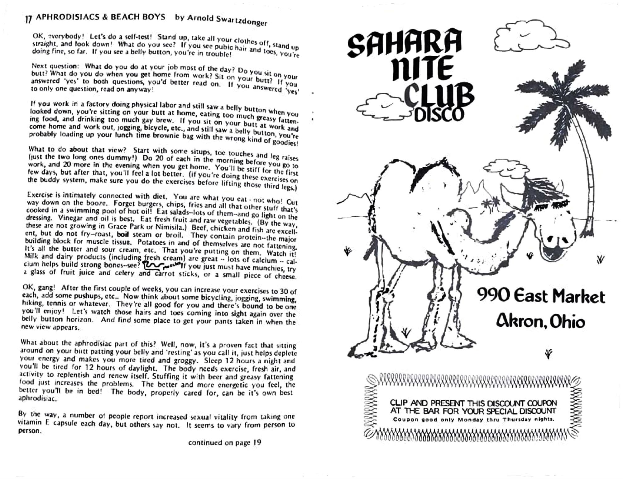 If you work in a factory doing physical labor and still saw a belly button when you looked down, you're sitting on your butt at home, eating too much greasy fatten ing food, and drinking too much gay brew. If you sit on your butt at work and come home and work out, jogging, bicycle, etc., and still saw a belly button, you're probably loading up your lunch time brownie bag with the wrong kind of goodies! What to do about that view? Start with some situps, toe touches and leg raises (just the two long ones dummy!) Do 20 of each in the morning before you go to work, and 20 more in the evening when you get home. You'll be stiff for the first few days, but after that, you'll feel a lot better. (if you're doing these exercises on the buddy system, make sure you do the exercises before lifting those third legs.) Exercise is intimately connected with diet. You are what you eat not who! Cut way down on the booze. Forget burgers, chips, fries and all that other stuff that's cooked in a swimming pool of hot oil! Eat salads--lots of them-and go light on the dressing. Vinegar and oil is best. Eat fresh fruit and raw vegetables. (By the way, these are not growing in Grace Park or Nimisila.) Beef, chicken and fish are excellent, but do not fry-roast, boil steam or broil. They contain protein--the major building block for muscle tissue. Potatoes in and of themselves are not fattening. It's all the butter and sour cream, etc. That you're putting on them. Watch it! Milk and dairy products (including fresh cream) are great lots of calcium calcium helps build strong bones-see? If you just must have munchies, try