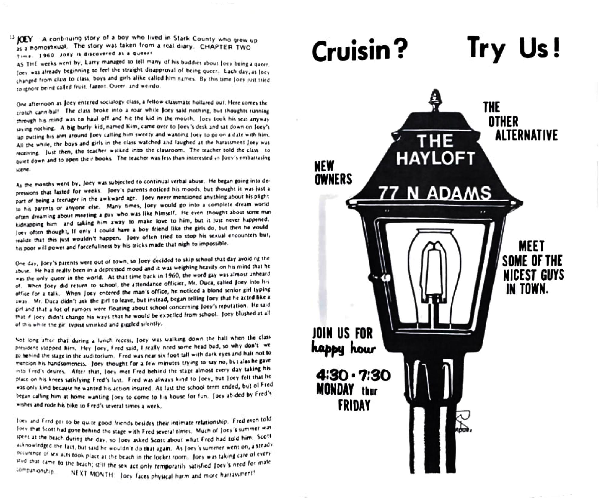 AS THE weeks went by, Larry managed to tell many of his buddies about Joey being a queer. Joey was already beginning to feel the straight disapproval of being queer. Each day, as Joey changed from class to class, boys and pris alike called him names. By this time Joey just tried to ignore being called fruit, fazeot. Queer and weirdo.