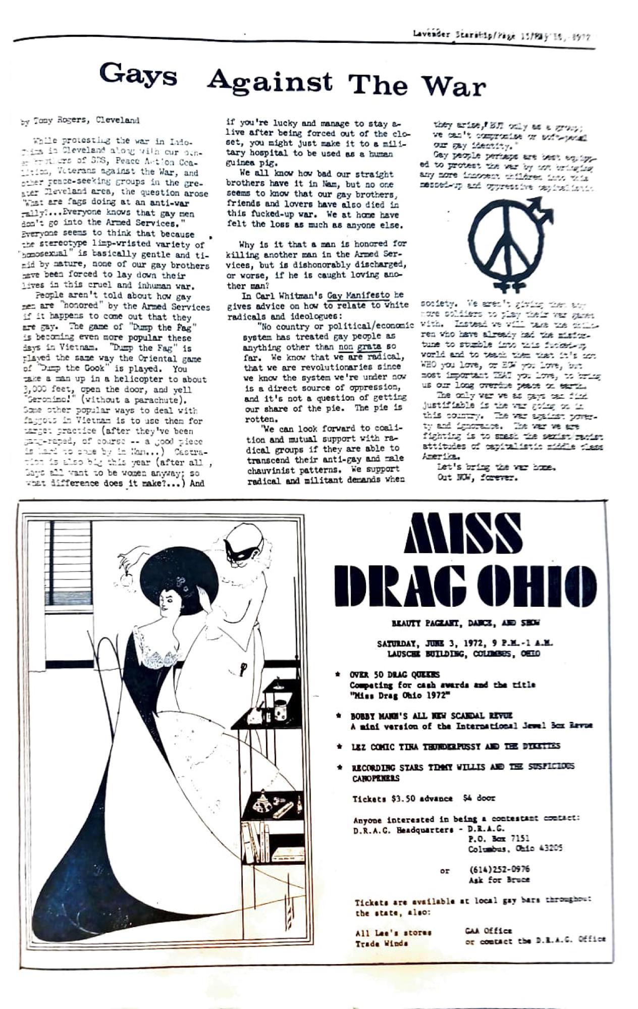 in Cleveland along with cur ontre of SDS, Peace Action Con11, Veterans against the War, and other peace-seeking groups in the grester Cleveland area, the question arose What are fags doing at an anti-var ally?...Everyone knows that gay men don't go into the Armed Services." Everyone seems to think that because the stereotype limp-vristed variety of "homosexual" is basically gentle and tiid by nature, none of our gay brothers. have been forced to lay down their lives in this cruel and inhuman war.