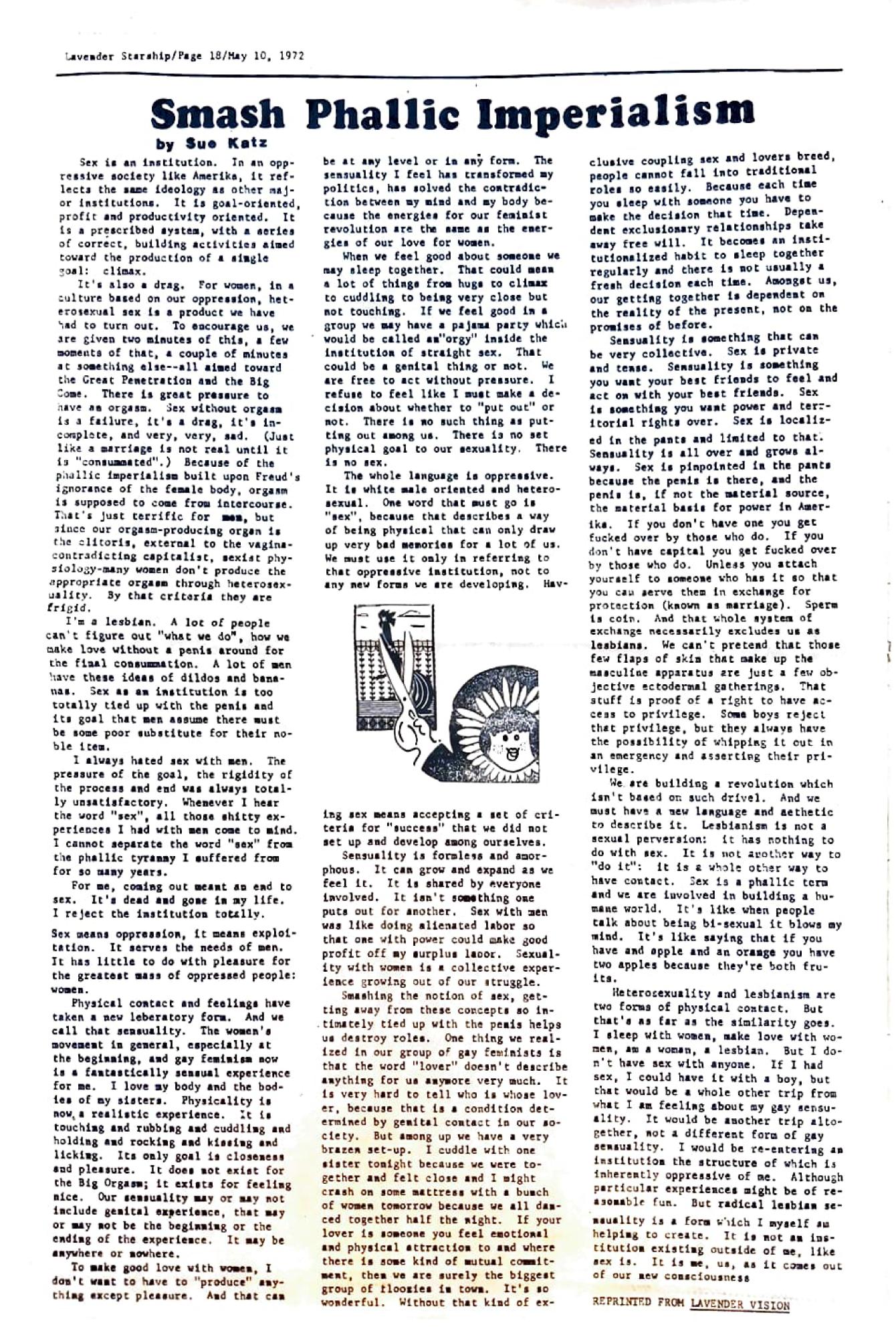Smashing the notion of sex, getting away from these concepts so intimately tied up with the penis helps us destroy roles. One thing we realized in our group of gay feminists is that the word "lover" doesn't describe anything for us anymore very much. It is very hard to tell who is whose lover, because that is a condition determined by genital contact in our society. But among up we have a very brazen set-up. I cuddle with one sister tonight because we were together and felt close and I might crash on some mattress with a bunch of women tomorrow because we all dasced together half the night. If your lover is someone you feel emotional and physical attraction to and where there is some kind of mutual commitment, then we are surely the biggest group of tloozies in town. It's so wonderful. Without that kind of ex-
