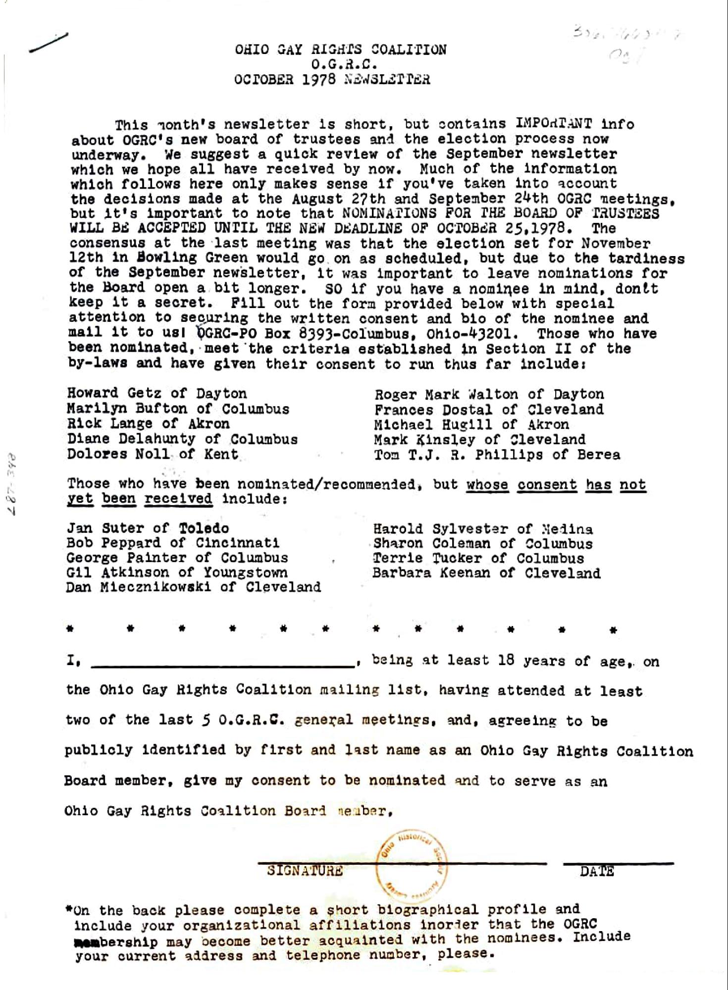 publicly identified by first and last name as an Ohio Gay Rights Coalition Board member, give my consent to be nominated and to serve as an