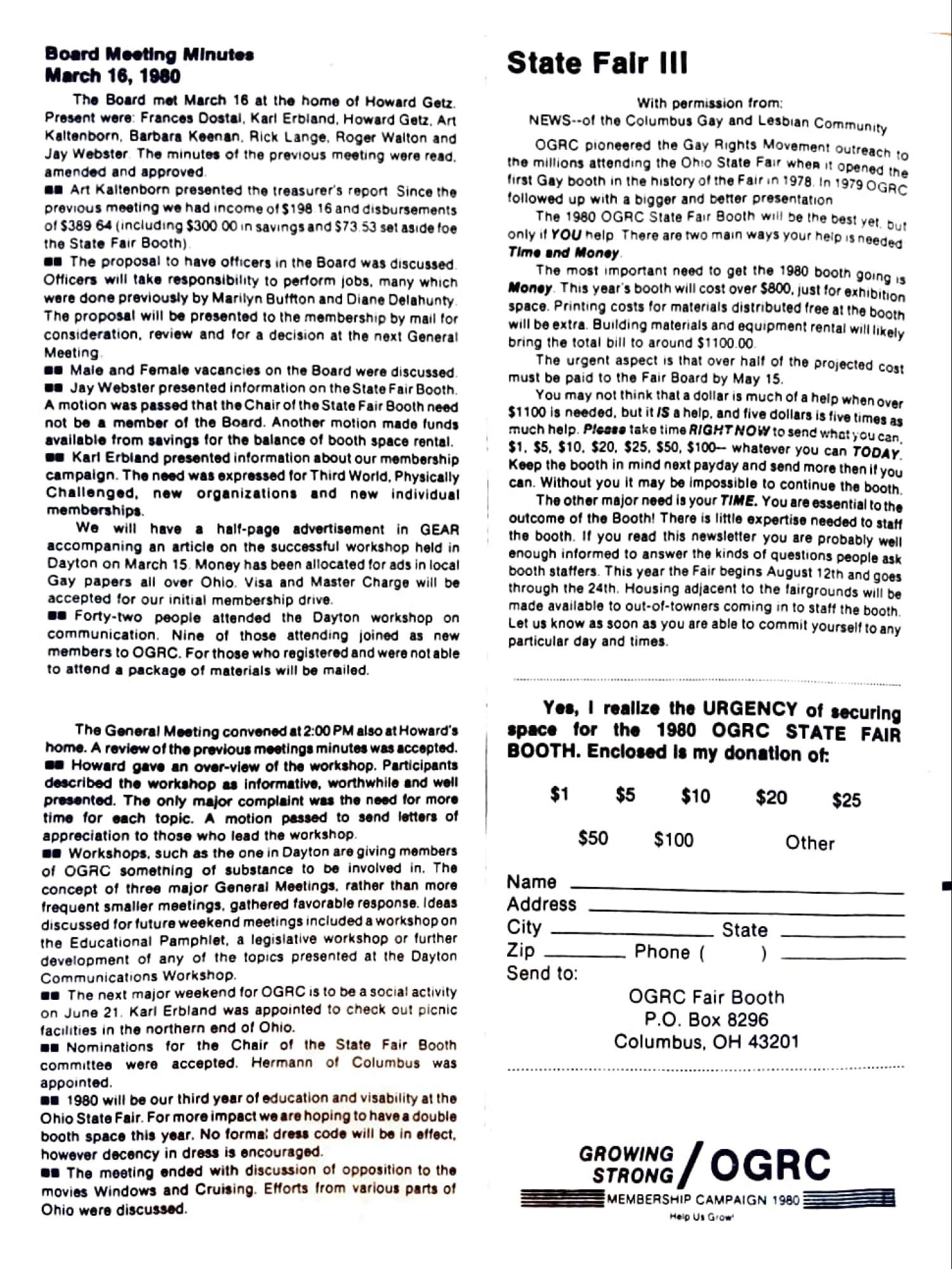 We will have a half-page advertisement in GEAR accompaning an article on the successful workshop held in Dayton on March 15. Money has been allocated for ads in local Gay papers all over Ohio. Visa and Master Charge will be accepted for our initial membership drive.
