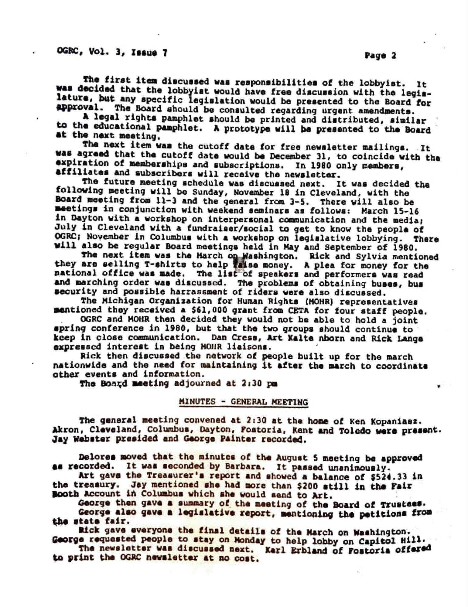 The future meeting schedule was discussed next. It was decided the following meeting will be Sunday, November 18 in Cleveland, with the Board meeting from 11-3 and the general from 3-5. There will also be Beetings in conjunction with weekend seminars as follows: March 15-16 in Dayton with a workshop on interpersonal communication and the media; July in Cleveland with a fundraiser/social to get to know the people of OGRC; November in Columbus with a workshop on legislative lobbying. There will also be regular Board meetings held in May and September of 1980. The next item was the Harch on Washington. Rick and Sylvia mentioned they are selling T-shirts to help ise money. A plea for money for the national office was made. The list of speakers and performers was read and marching order was discussed. The problems of obtaining buses, bus security and possible harrassment of riders were also discussed.