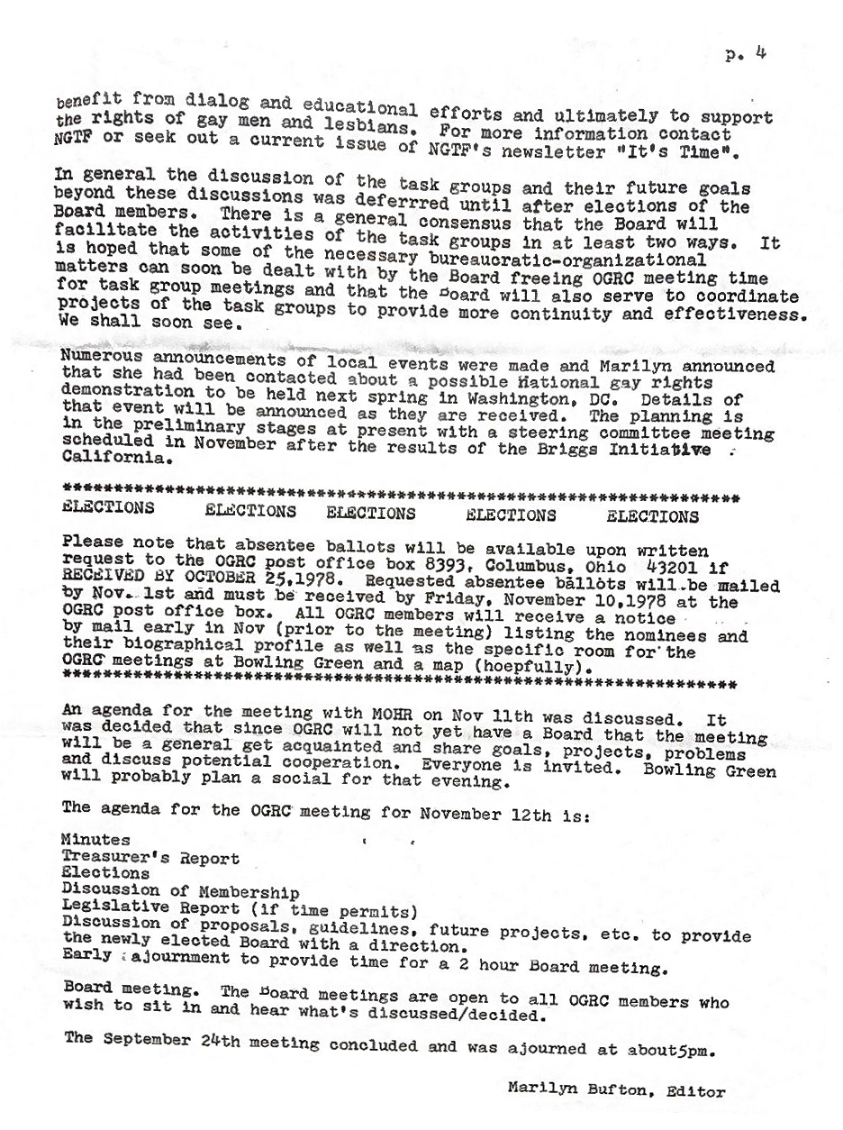 Please note that absentee ballots will be available upon written request to the OGRC post office box 8393, Columbus, Ohio 43201 if RECEIVED BY OCTOBER 25,1978. Requested absentee ballots will be mailed by Nov. 1st and must be received by Friday, November 10.1978 at the OGRC post office box. All OGRC members will receive a notice