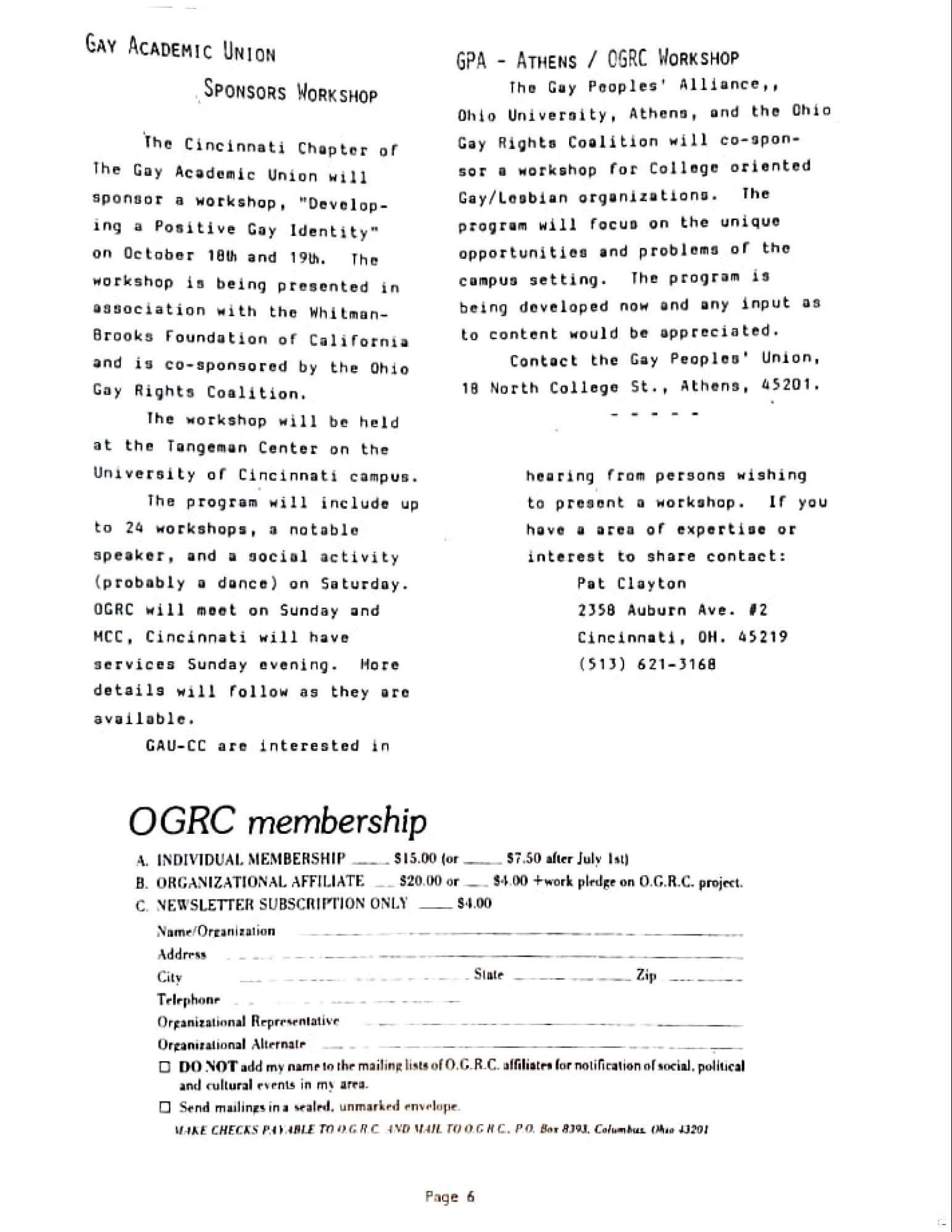 The Cincinnati Chapter of The Gay Academic Union will sponsor a workshop, "Developing a Positive Gay Identity" on October 18th and 19th. workshop is being presented in association with the WhitmanBrooks Foundation of California and is co-sponsored by the Ohio Gay Rights Coalition.