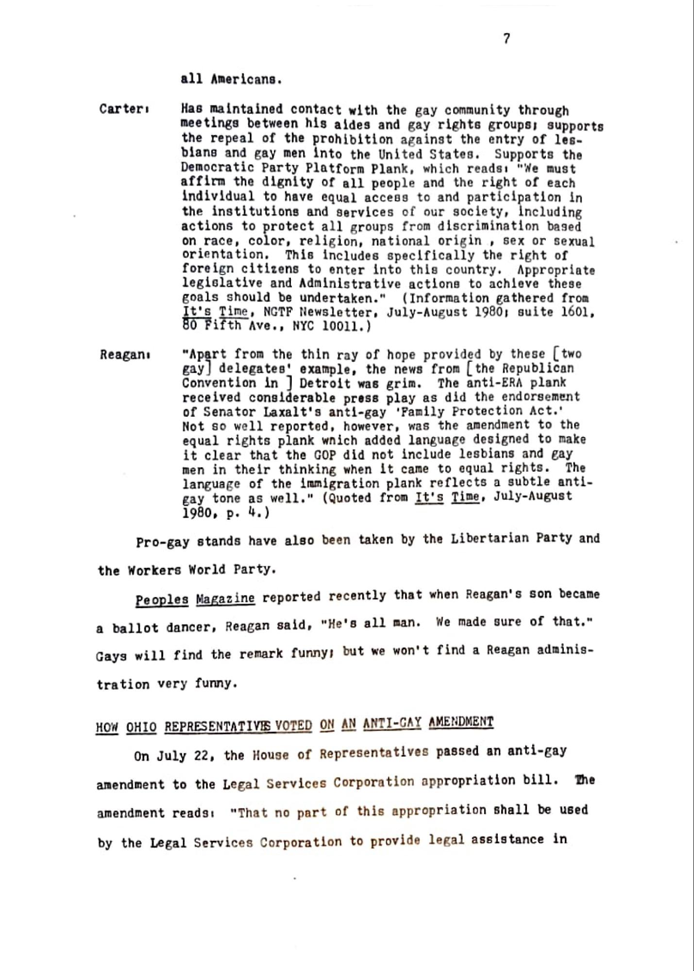 "Apart from the thin ray of hope provided by these [two gay] delegates' example, the news from [the Republican Convention in ] Detroit was grim. The anti-ERA plank received considerable press play as did the endorsement of Senator Laxalt's anti-gay 'Family Protection Act.' Not so well reported, however, was the amendment to the equal rights plank which added language designed to make it clear that the GOP did not include lesbians and gay men in their thinking when it came to equal rights. language of the immigration plank reflects a subtle antigay tone as well." (Quoted from It's Time, July-August 1980, p. 4.)