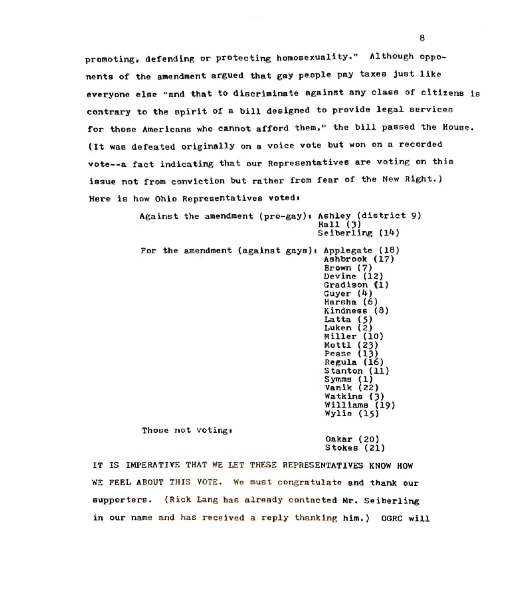 nents of the amendment argued that gay people pay taxes just like everyone else "and that to discriminate against any class of citizens is contrary to the spirit of a bill designed to provide legal services for those Americans who cannot afford them," the bill passed the House. (It was defeated originally on a voice vote but won on a recorded. vote--a fact indicating that our Representatives are voting on this issue not from conviction but rather from fear of the New Right.) Here is how Ohio Representatives voted: