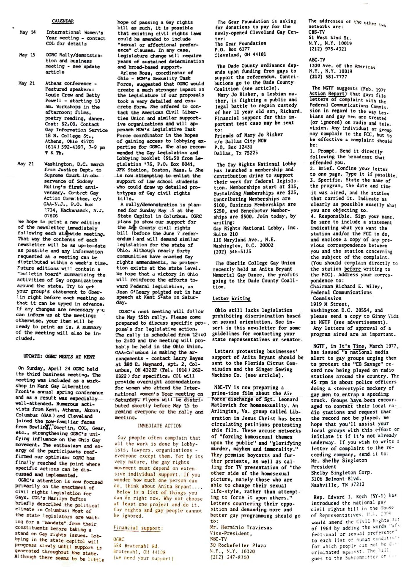 Arlene Ross, coordinator of Ohio NOW's Sexuality Task Force, suggested that OGRC would create a much stronger impact on the Legislature if our proposals took a very detailed and concrete form. She offered to contact the American Civil Liberties Union and similar supportive organizations and will approach NOW's Legislative Task Force coordinator in the hopes of gaining access to lobbying expertise for OGRC. She also recommended the Gay Legislation and Lobbying booklet ($1.50 from Legislation 76, P.O. Box 8841, JFK Station, Boston, Mass.). She is now attempting to enlist the support of law school students who could draw up detailed prototypes of Gay civil rights bills.