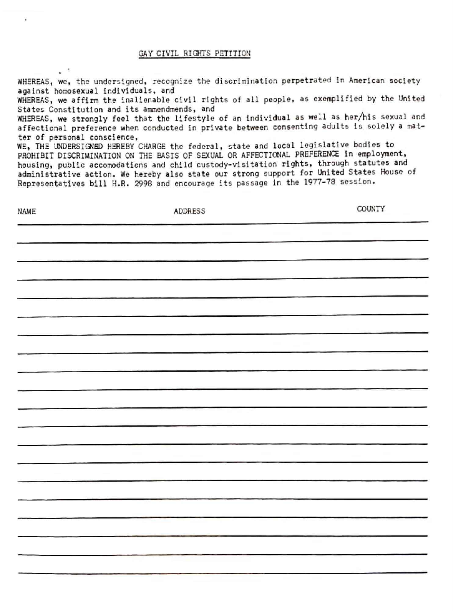 WE, THE UNDERSIGNED HEREBY CHARGE the federal, state and local legislative bodies to PROHIBIT DISCRIMINATION ON THE BASIS OF SEXUAL OR AFFECTIONAL PREFERENCE in employment, housing, public accomodations and child custody-visitation rights, through statutes and administrative action. We hereby also state our strong support for United States House of Representatives bill H.R. 2998 and encourage its passage in the 1977-78 session.
