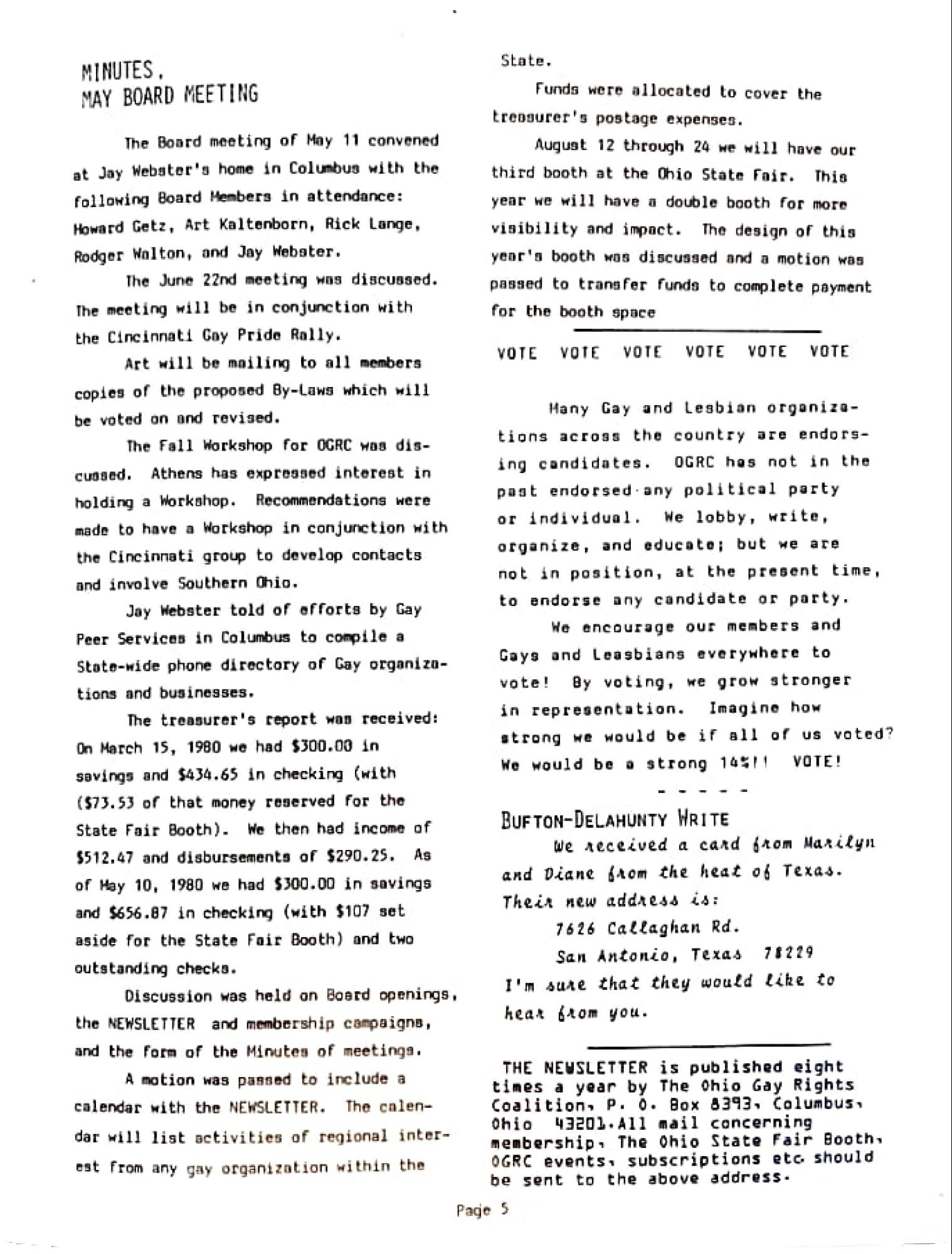 THE NEWSLETTER is published eight times a year by The Ohio Gay Rights Coalition. P. O. Box 8393, Columbus, Ohio 43201.All mail concerning membership. The Ohio State Fair Booth, OGRC events, subscriptions etc. should be sent to the above address.
