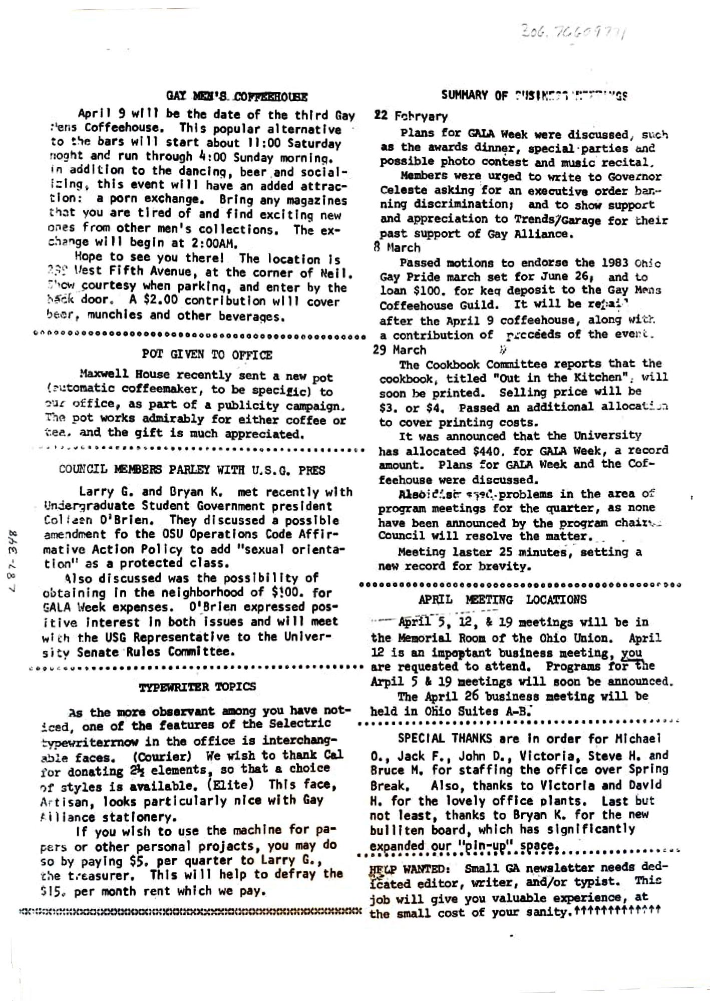 Members were urged to write to Governor Celeste asking for an executive order barning discrimination; and to show support and appreciation to Trends/Garage for their past support of Gay Alliance. 8 March