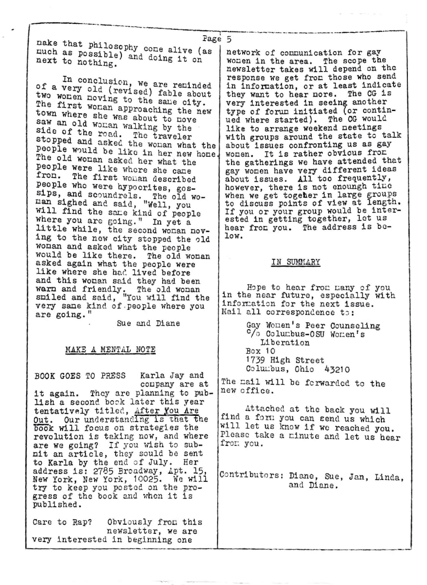 network of communication for gay wonen in the area. The scope the newsletter takes will depend on the response we get from those who send in information, or at least indicate they want to hear nore. The CG is very interested in seeing another type of forum initiated (or continued where started). The CG would like to arrange weekend meetings with groups around the state to talk about issues confronting us as gay wonen. It is rather obvious fro the gatherings we have attended that gay women have very different ideas about issues. All too frequently, however, there is not enoungh time when we get togeher in large groups to discuss points of view at length. If you or your group would be interested in getting together, let us hear froд you. The address is be-