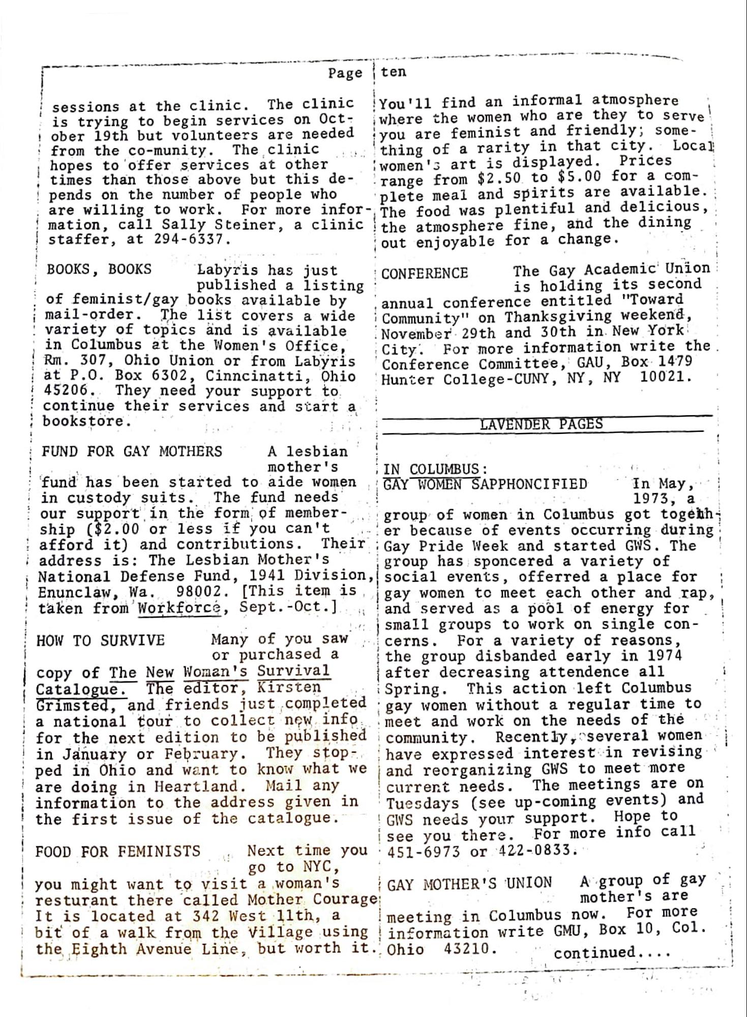 group of women in Columbus got togeth er because of events occurring during Gay Pride Week and started GWS. The group has sponcered a variety of social events, offerred a place for gay women to meet each other and rap, and served as a pool of energy for small groups to work on single concerns. For a variety of reasons, the group disbanded early in 1974 after decreasing attendence all Spring. This action left Columbus gay women without a regular time to meet and work on the needs of the community. community. Recently, several women have expressed interest in revising and reorganizing GWS to meet more current needs. The meetings are on Tuesdays (see up-coming events) and GWS needs your support. Hope to see you there. For more info call 451-6973 or 422-0833.