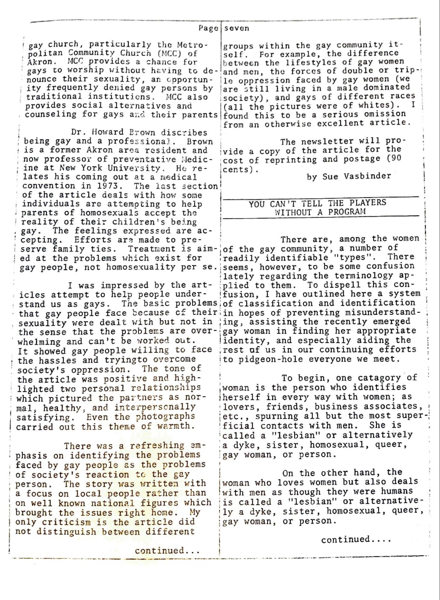le oppression faced by gay women (we are still living in a male dominated society), and gays of different races (all the pictures were of whites). I found this to be a serious omission from an otherwise excellent article. The newsletter will provide a copy of the article for the cost of reprinting and postage (90 cents).
