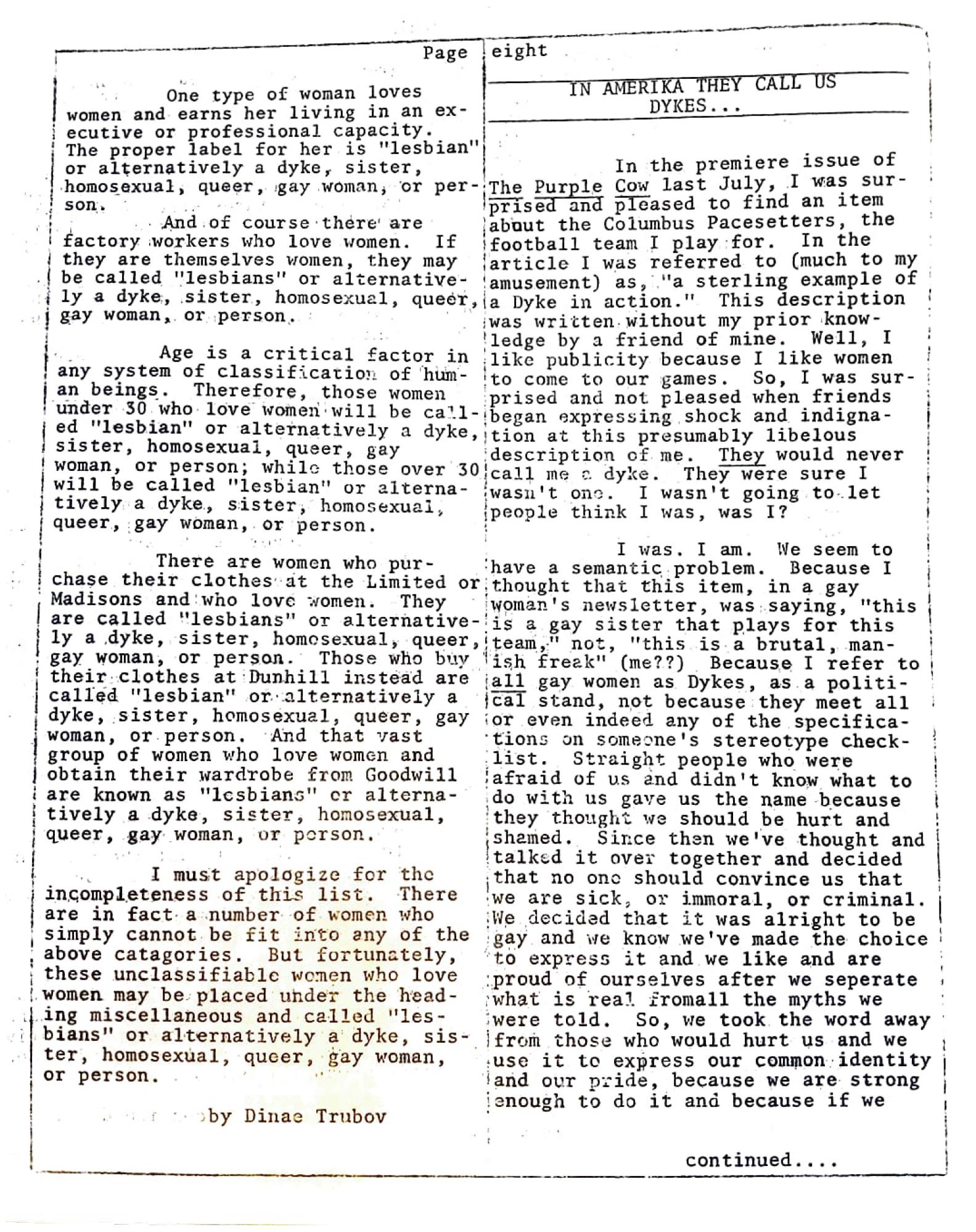 In the premiere issue of The Purple Cow last July, I was surprised and pleased to find an item about the Columbus Pacesetters, the football team I play for. In the article I was referred to (much to my amusement) as, "a sterling "a sterling example of a Dyke in action." This description was written without my prior knowledge by a friend of mine. Well, I like publicity because I like women to come to our games. So, I was surbegan expressing shock and indignaprised and not pleased when friends tion at this presumably libelous description of me. They would never call me a dyke. They were sure I wasn't one. I wasn't going to let people think I was, was I?