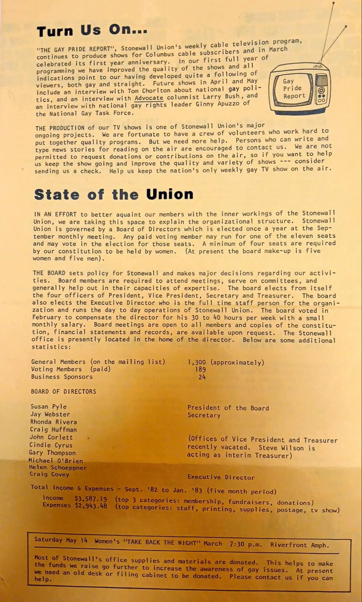 "THE GAY PRIDE REPORT", Stonewall Union's weekly cable television program, continues to produce shows for Columbus cable subscribers and in March celebrated its first year anniversary. In our first full year of programming we have improved the quality of the shows and all indications point to our having developed quite a following of viewers, both gay and straight. Future shows in April and May include an interview with Tom Chorlton about national gay politics, and an interview with Advocate columnist Larry Bush, and an interview with national gay rights leader Ginny Apuzzo of the National Gay Task Force.