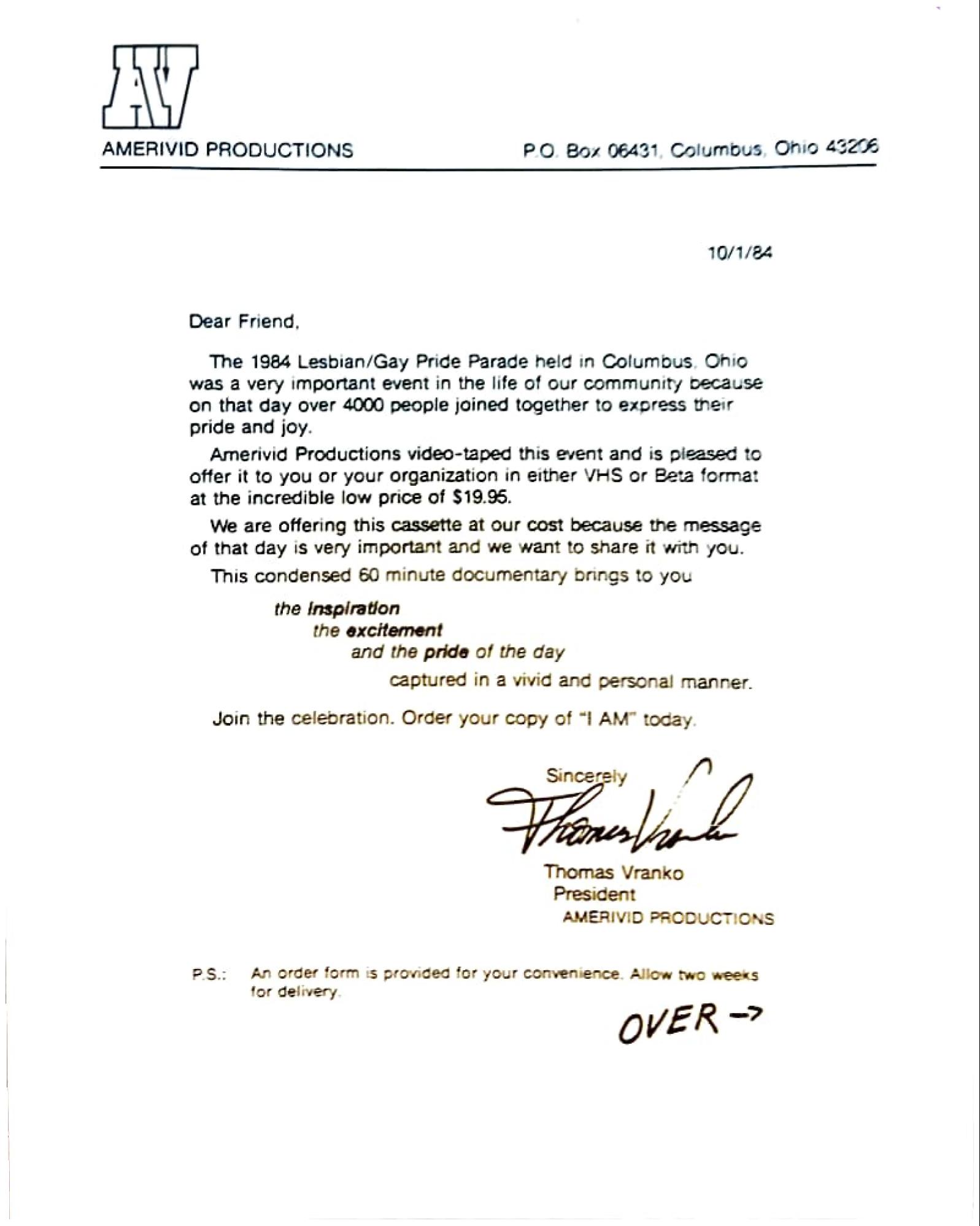 The 1984 Lesbian/Gay Pride Parade held in Columbus, Ohio was a very important event in the life of our community because on that day over 4000 people joined together to express their pride and joy.